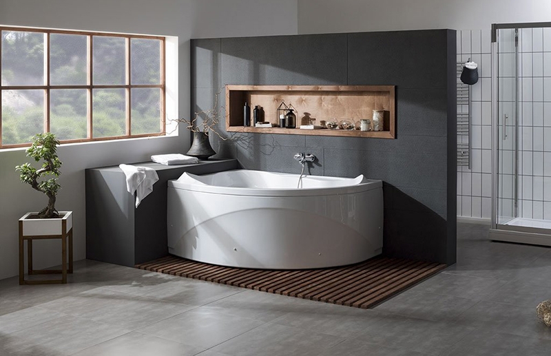 Левосторонняя асимметричная угловая ванна с изящным дизайном дополнит интерьер ванной комнаты в современном стиле.