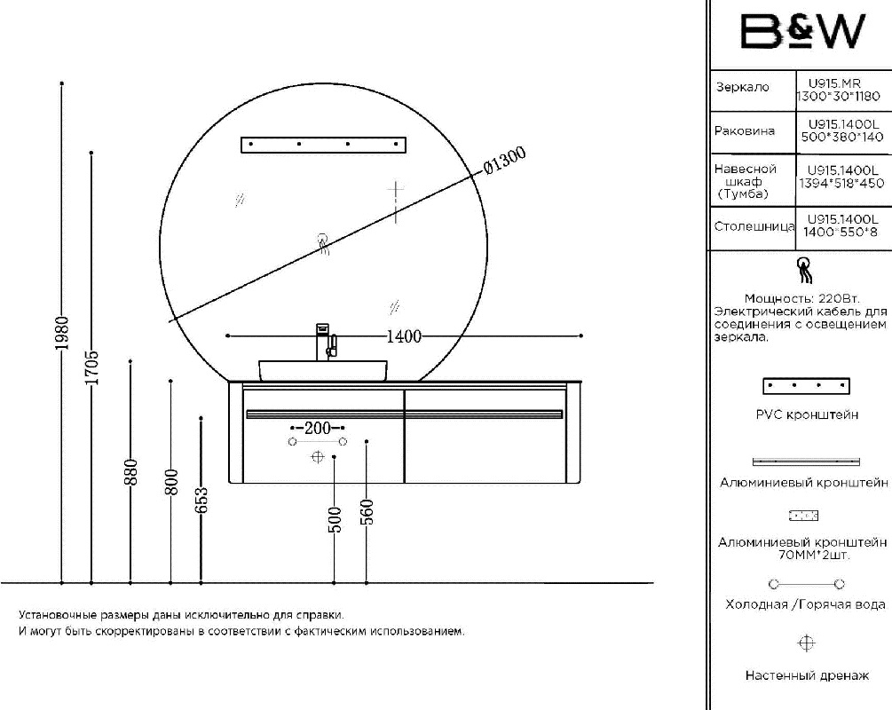 Комплект мебели Black&White Universe U915.1400 R/L, 140 см, тумба серая