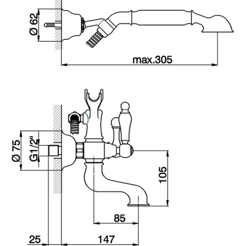 CISAL Arcana Toscana Смеситель настенный для ванны/душа с ручной лейкой,держателем и шлангом, цвет бронза