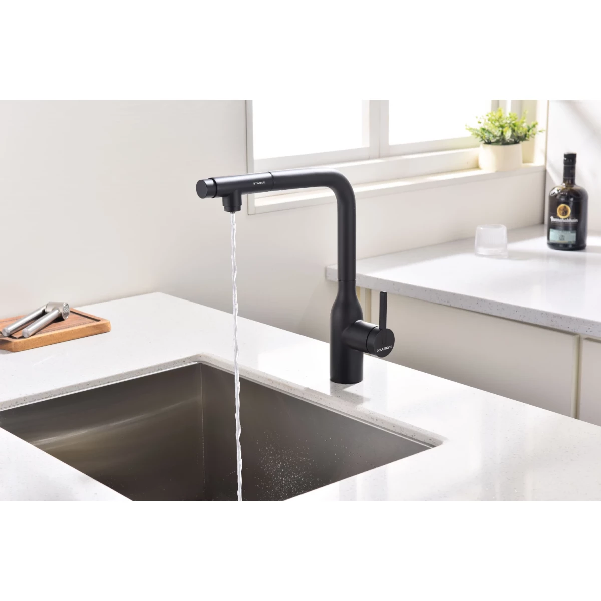 Смеситель VIPER имеет отдельный канал для питьевой воды. Переключение режимов осуществляется с помощью удобной и эргономично расположенной кнопки. Благодаря такому функционалу, потоки воды не смешиваются, а переключение осуществляется максимально комфортно.