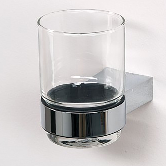 Стакан для зубных щеток Акванет 5684 00187060 выполнен из прозрачного стекла. Создается впечатление, что стаканчик вмонтирован внутрь массивного металлического кольца, который надежно закреплен на стене.